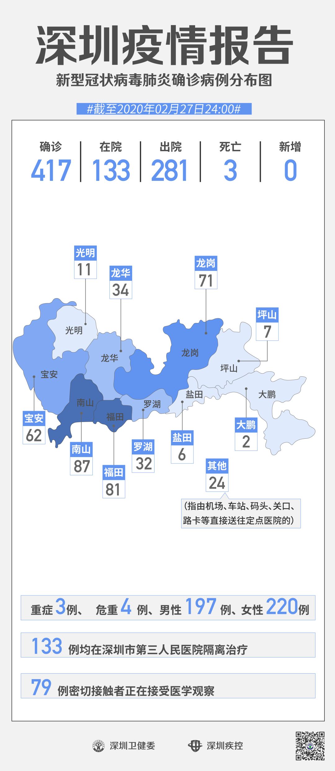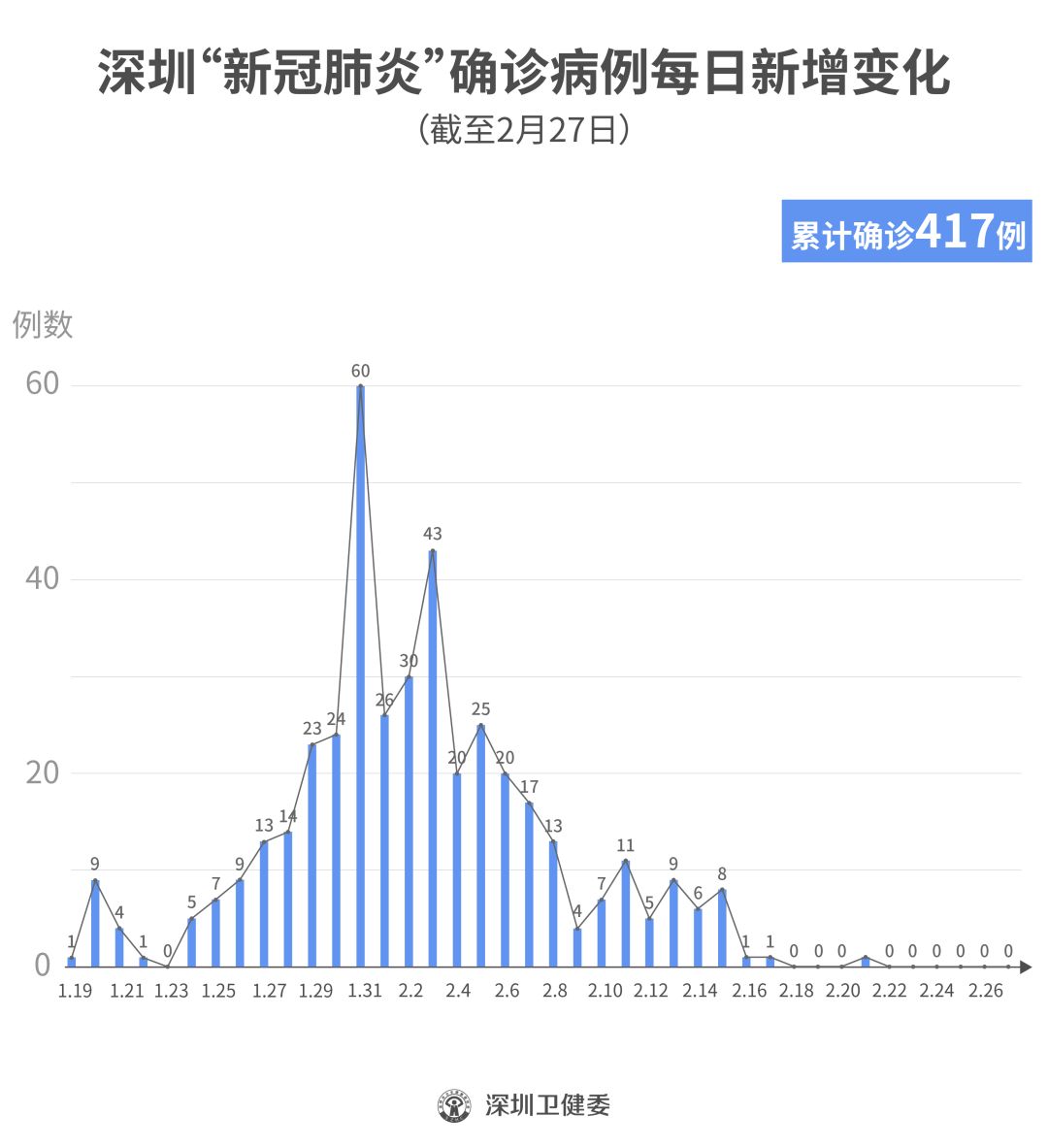 截至2月27日24時(shí),深圳累計(jì)報(bào)告“新冠肺炎”確診病例417例。2月27日當(dāng)天全市無(wú)新增確診病例,當(dāng)天出院病例10例(從26日起不再公布出院個(gè)案)。